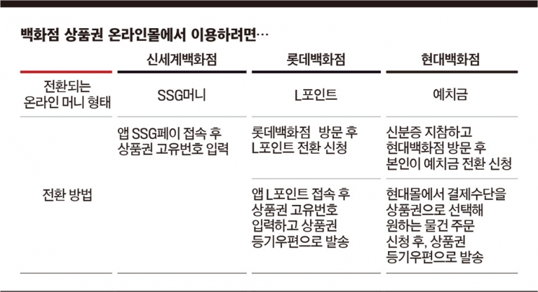 특히 롯데백화점과 현대백화점 상황이 열악하다. 두 백화점 상품권은 집 안에서, 손가락으로만 간단히 온라인 머니로 변경할 수 없다. 롯데백화점 상품권이 있는 소비자는 근처 롯데백화점을 방문해, 롯데카드센터에서 이름과 핸드폰 번호를 남기고 해당 금액을 ‘L포인트’로 변경해야 한다.